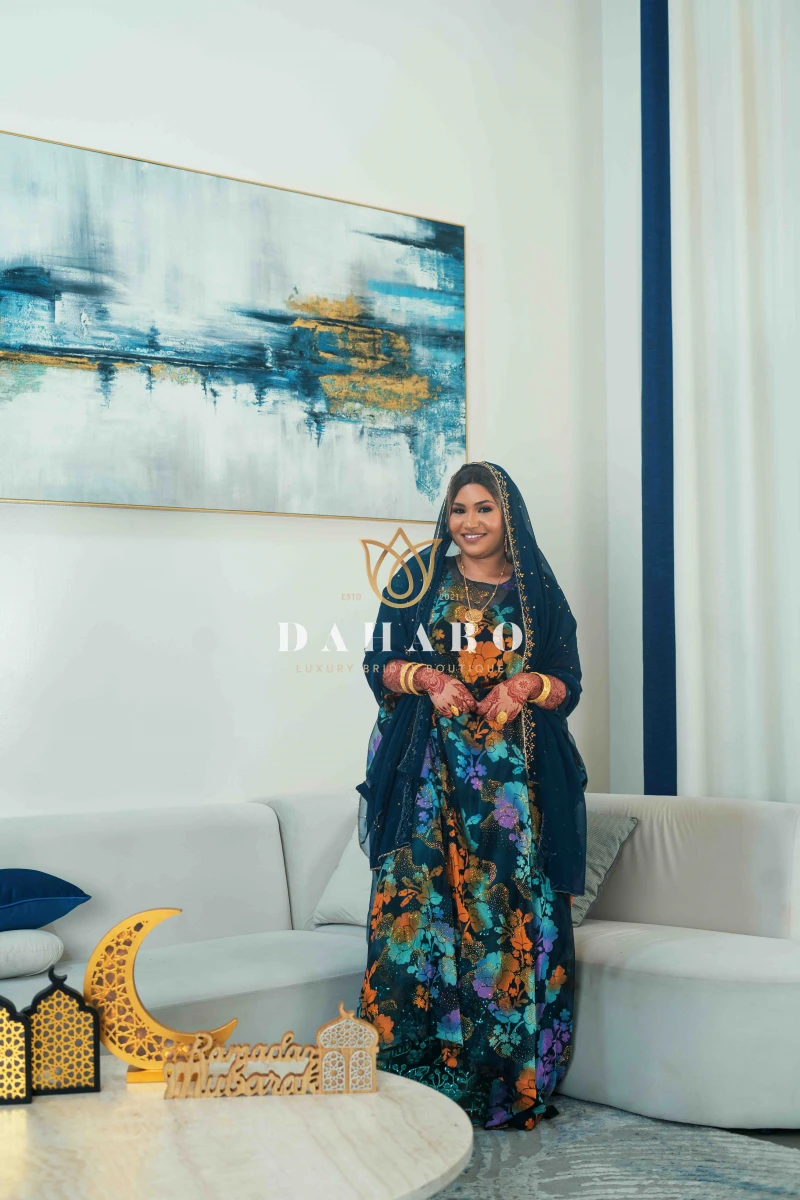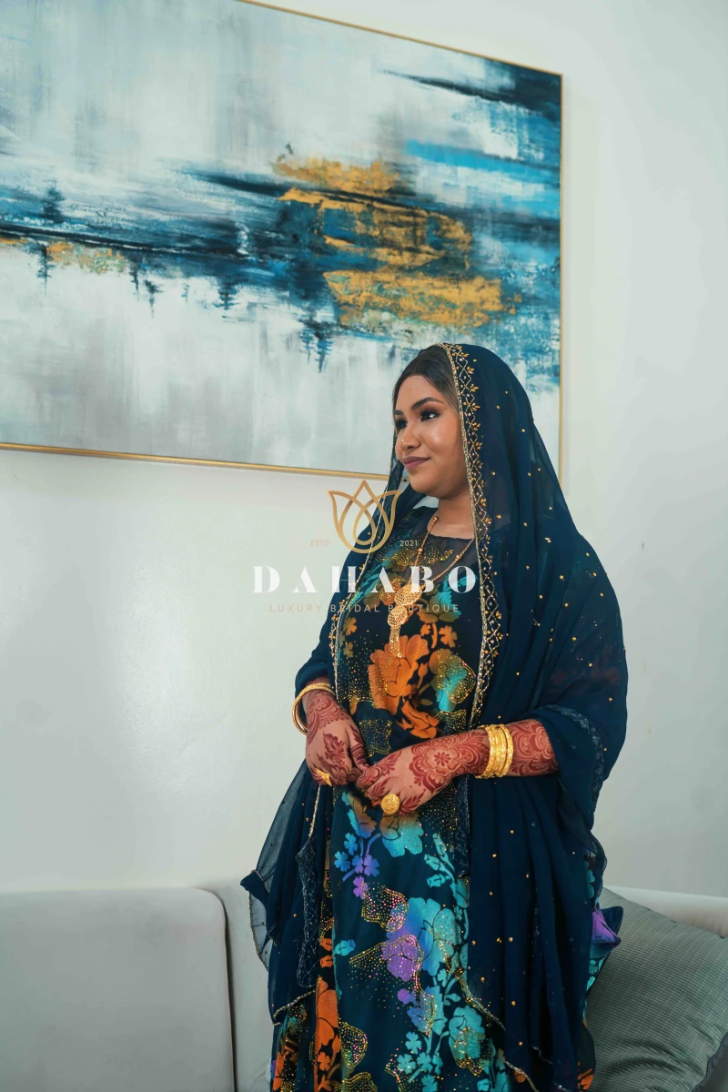 Beige &Navy Blue -Design features: Fabric- Radiate luxury Satin harir with stones and flower pattern Complete set- dirac, gogorad (underskirt) and garbasar (shawl). Please inform us if you need tailoring service we offer tailoring services should you want your dirac set sewn (as seen pictured above) and ready to wear. Kindly select “TAILORED” or UNTAILORED” provide your full height (cm) on the comments/notes section at checkout. Color: Beige & Navy Blue Size: Bacwayne (150 cm width)
