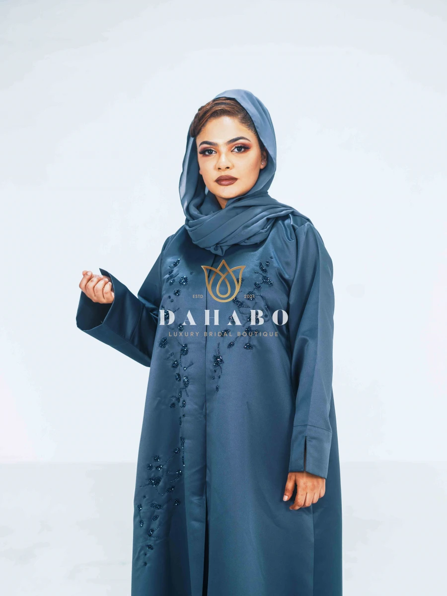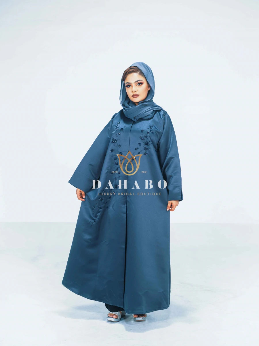 This black abaya features a sleek blue collared pattern for a chic and modern look. Made from soft, high-quality fabric, it’s comfortable and stylish. Perfect for any occasion, this abaya offers a simple yet elegant design that’s easy to wear and timeless.