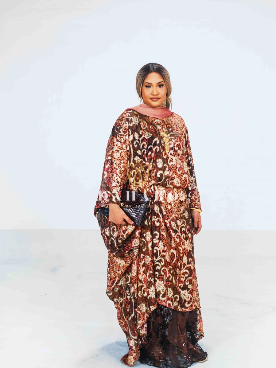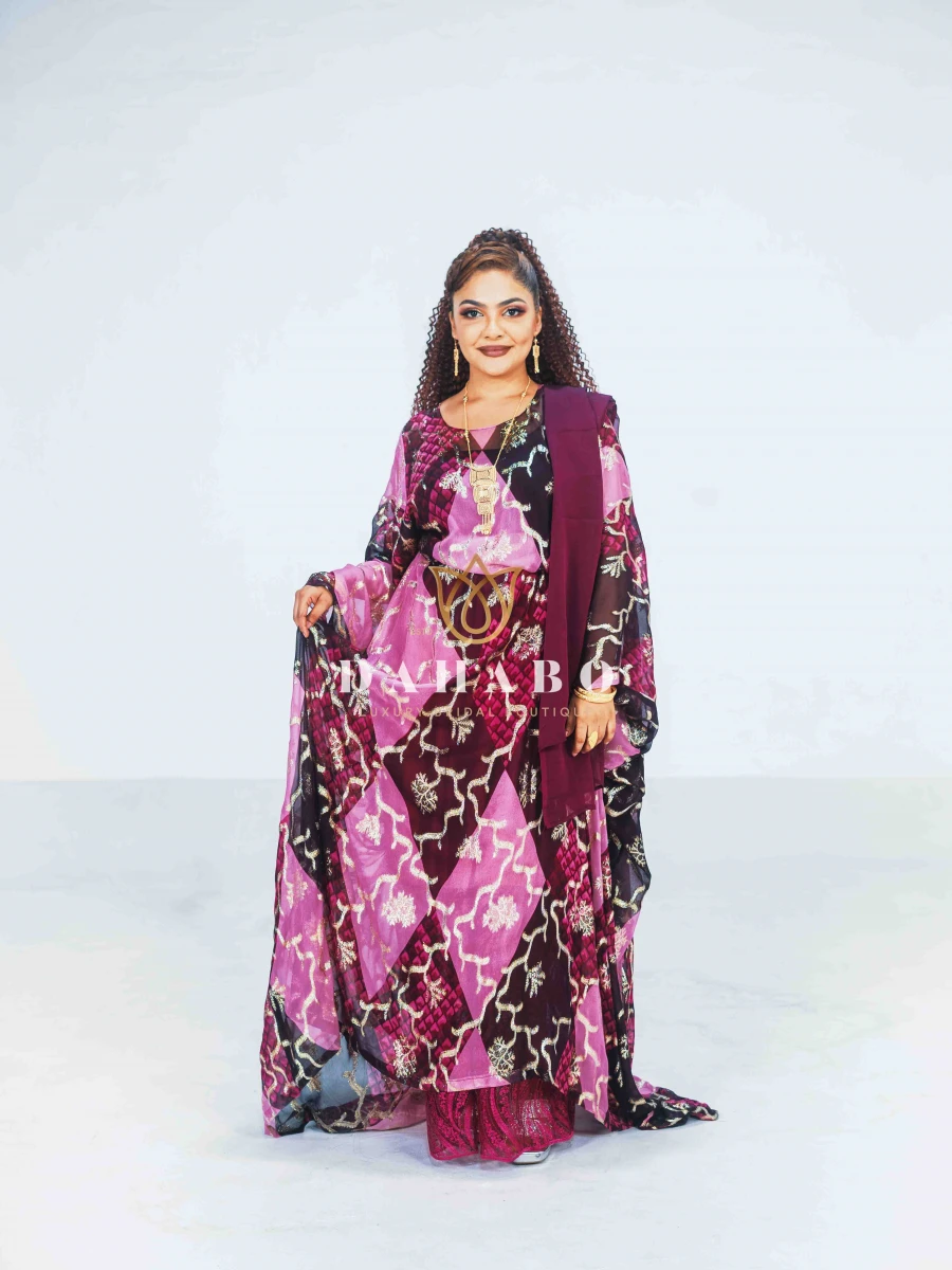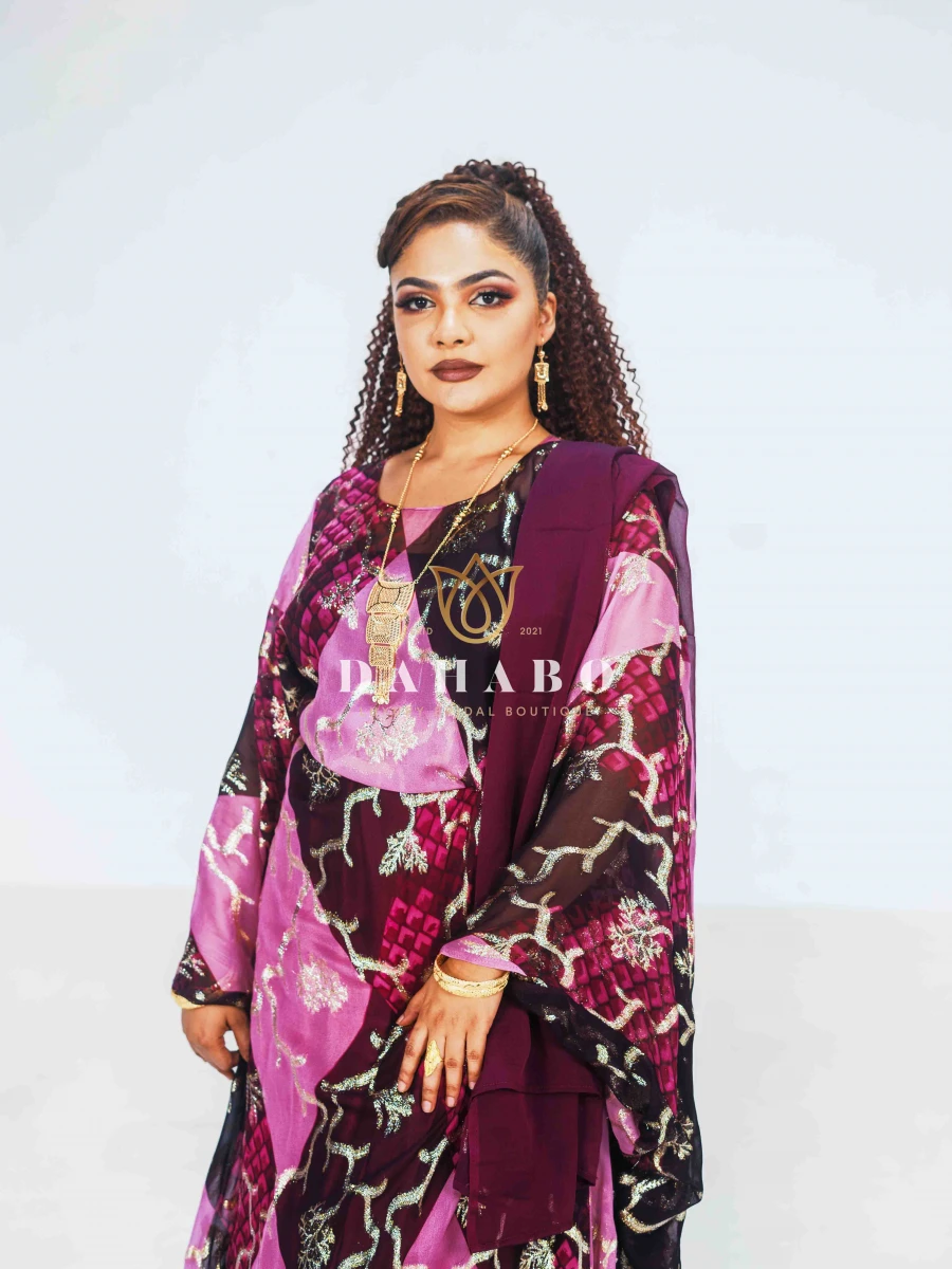 Haweeya Dirac Feature: Fabric- Radiate luxury chiffon with shimmer patterns. Complete set- dirac, gogorad (underskirt) and garbasar (shawl). Please inform us if you need tailoring service we offer tailoring services should you want your dirac set sewn (as seen pictured above) and ready to wear. Kindly select “TAILORED” or UNTAILORED” provide your full height (cm) on the comments/notes section at checkout. Color: Purple Size: Bacwayne (150 cm width)