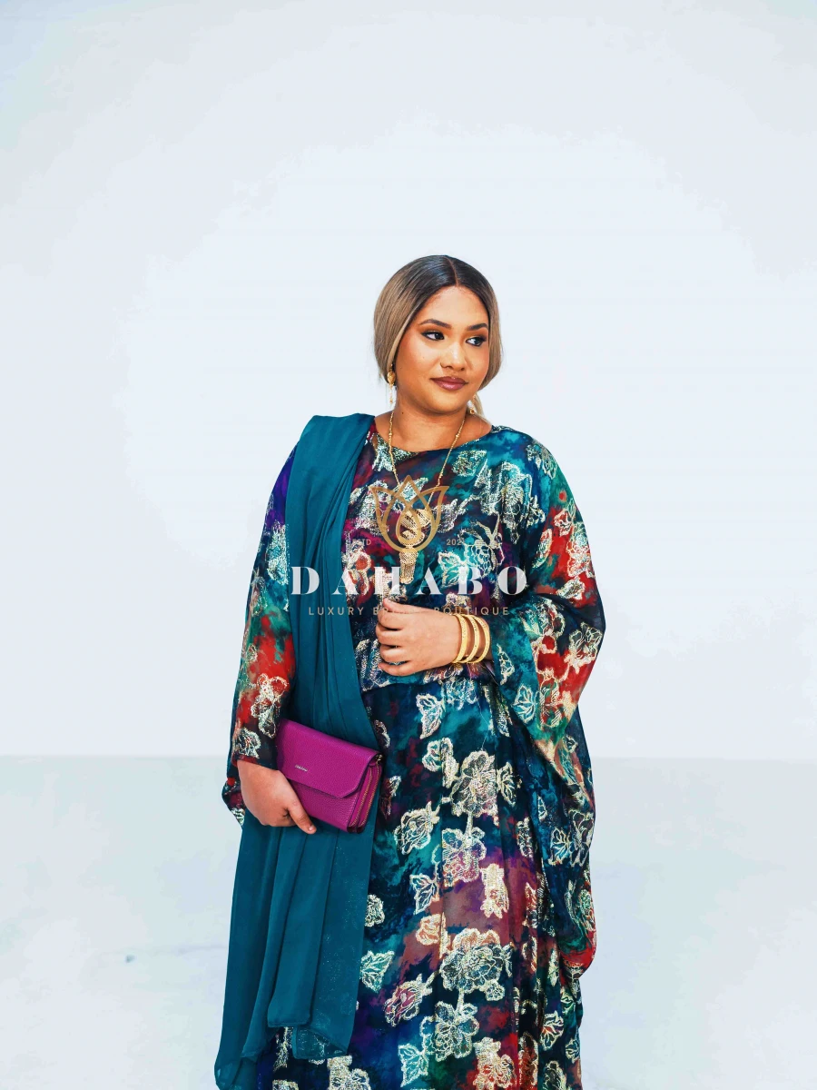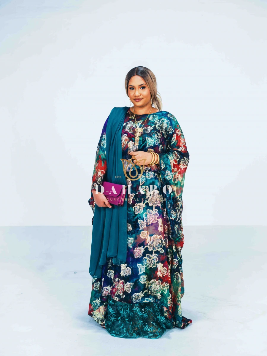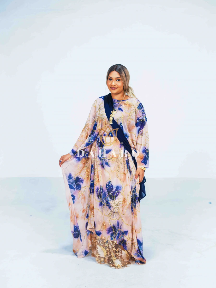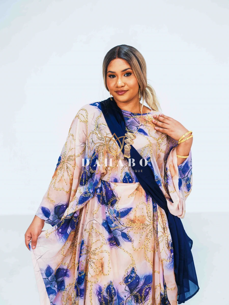 Hodan Fransawi Dirac Feature: Fabric- Radiate luxury chiffon with shimmer patterns. Complete set- dirac, gogorad (underskirt) and garbasar (shawl). Please inform us if you need tailoring service we offer tailoring services should you want your dirac set sewn (as seen pictured above) and ready to wear. Kindly select “TAILORED” or UNTAILORED” provide your full height (cm) on the comments/notes section at checkout. Color: Blue Size: Bacwayne (150 cm width)