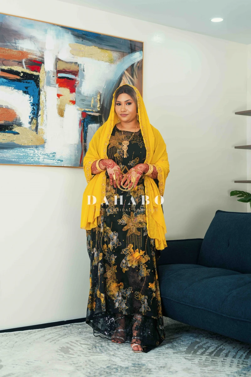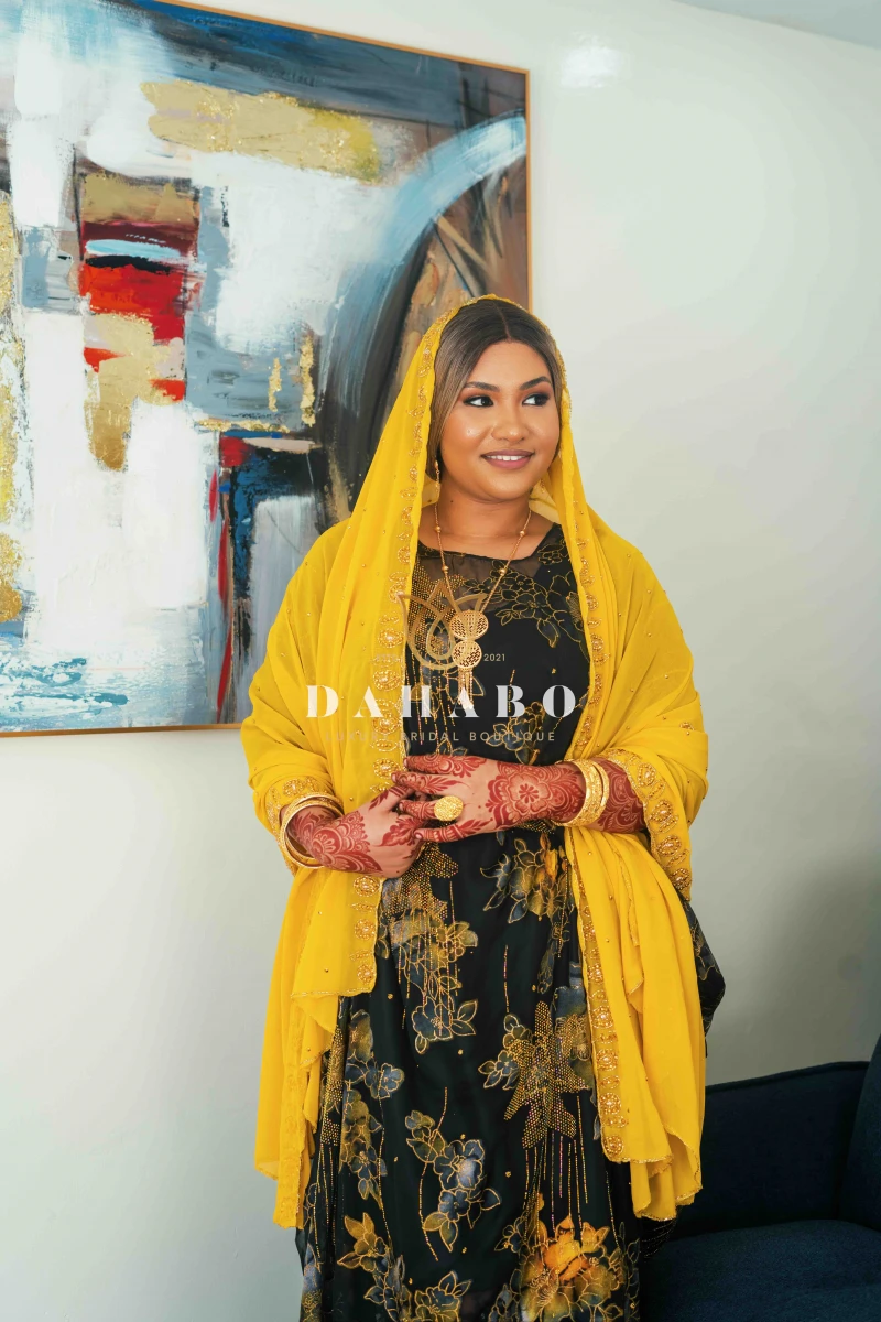 Yellow Harir Dirac Set Fabric- Radiate luxury Satin harir with stones and flower pattern. Complete set- dirac, gogorad (underskirt) and garbasar (shawl). Please inform us if you need tailoring service we offer tailoring services should you want your dirac set sewn (as seen pictured above) and ready to wear. Kindly select “TAILORED” provide your full height (cm) on the comments/notes section at checkout. Color: Yellow Size: Half Bac (109 cm width)