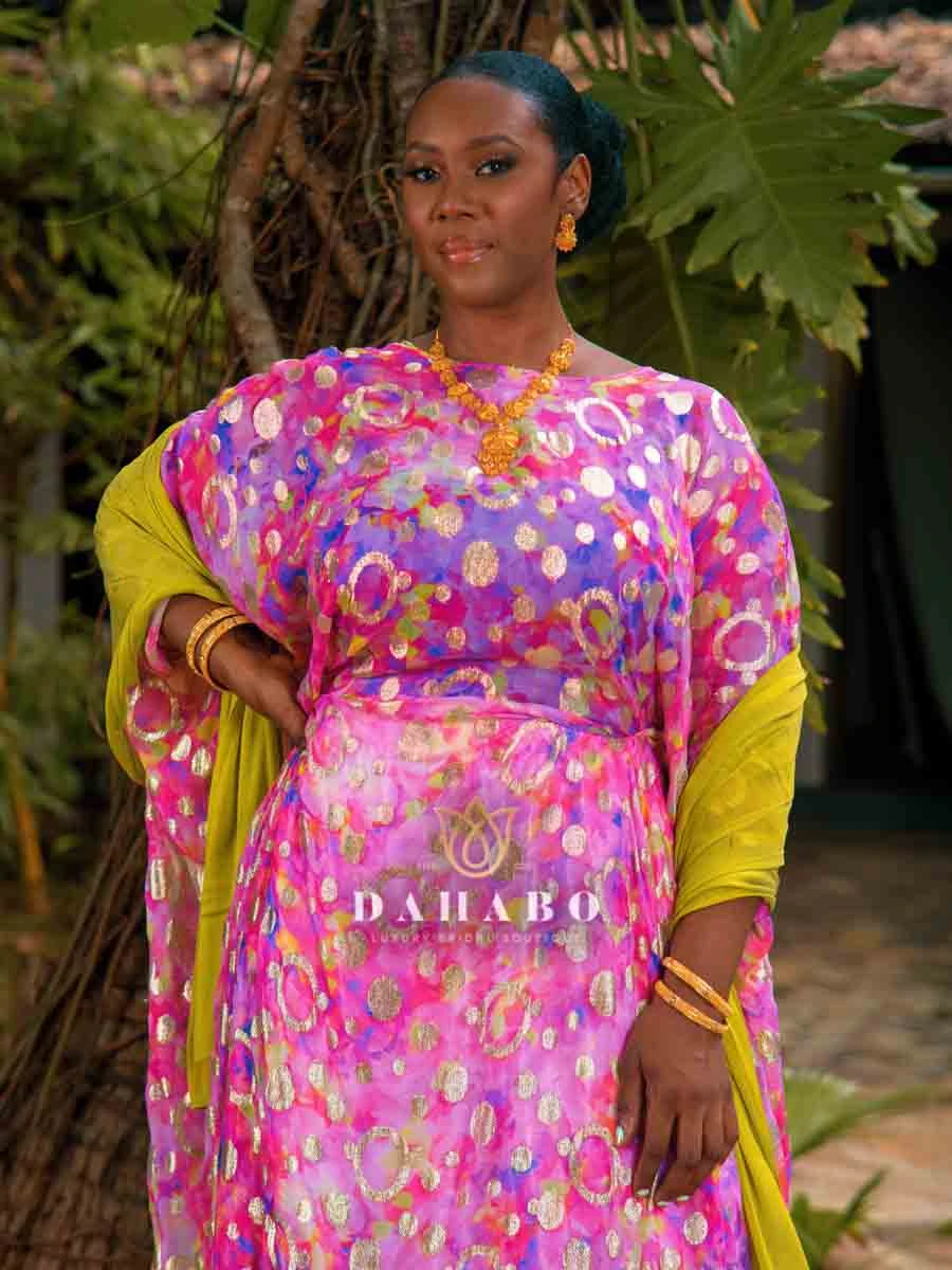 Pink & Lime Rainbow Set - Design features: Fabric- Radiate luxury chiffon with shimmer patterns. Complete set- dirac, gogorad (underskirt) and garbasar (shawl). Please inform us if you need tailoring service we offer tailoring services should you want your dirac set sewn (as seen pictured above) and ready to wear. Kindly select “TAILORED” or UNTAILORED” provide your full height (cm) on the comments/notes section at checkout. Color:Pink & Lime Size: Bacwayne (150 cm width)